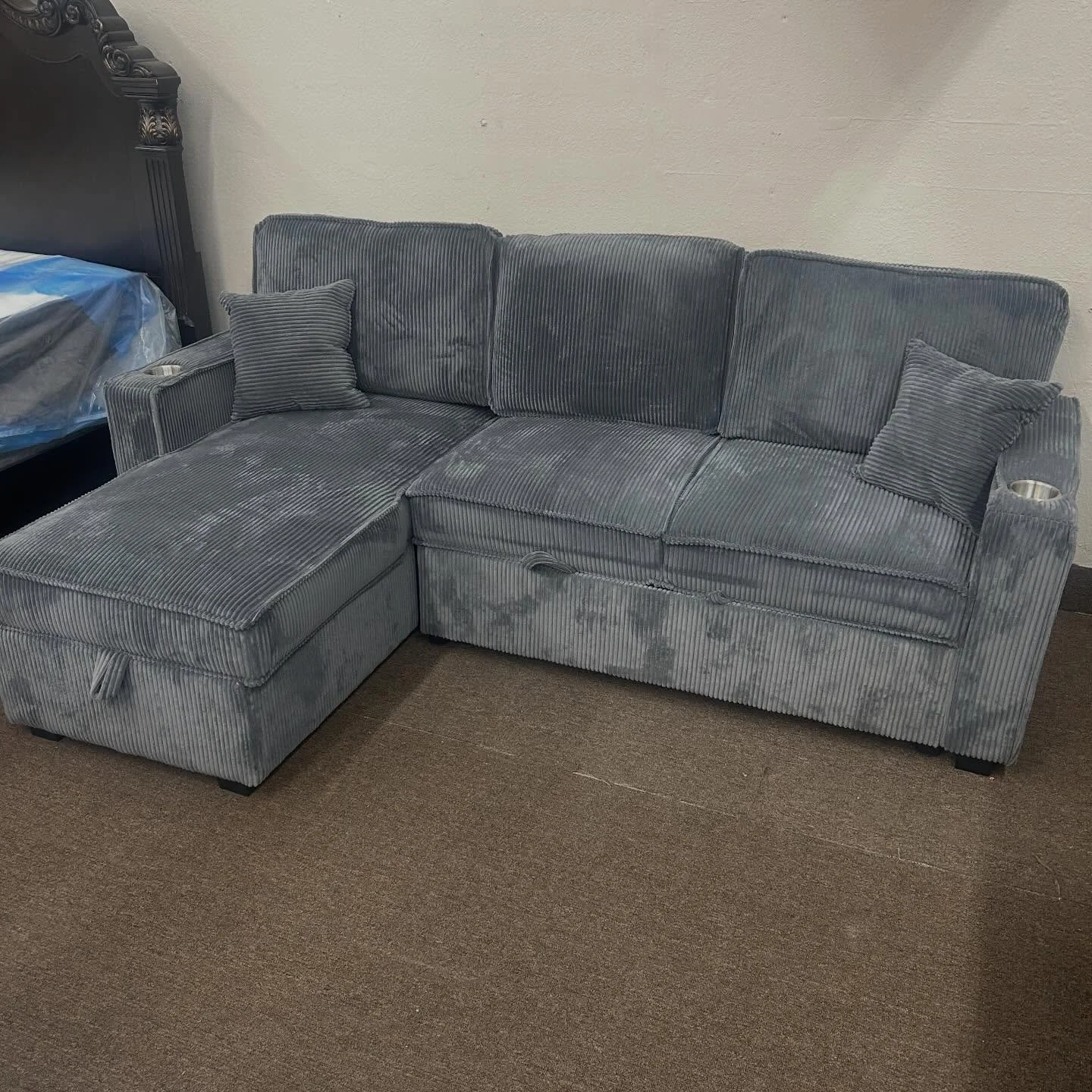 This versatile sectional is designed to adapt to your space, featuring a reversible chaise lounge with hidden storage, a built-in cup holder, and a USB port for added convenience. It easily transforms into a bed with a pull-out extension and front handles, offering an extra sleeping area or a cozy spot for lounging.